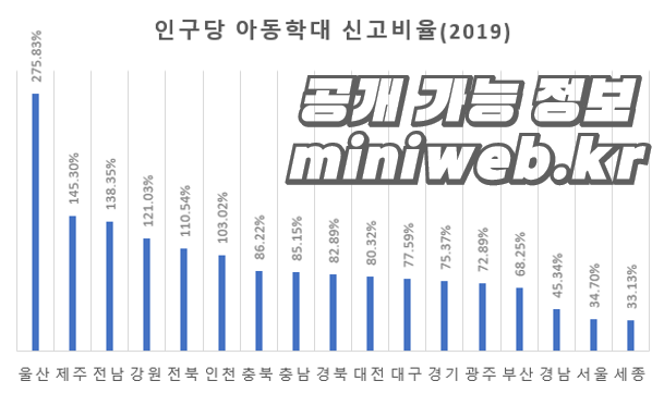 2019년 기준, 인구 1,000 명당 아동학대 사건 신고 건수 비율입니다.