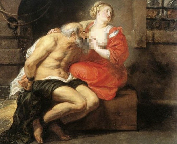 젊은 여인이 부끄럼도 없이 젖가슴을 드러내고 있고 거의 벗다싶이 한 노인이 젊은 여인의 젖을 빨고 있습니다. 루벤스(Rubens)의 작품이며, 제목은 'Cimon and Pero(키몬과 페로)' 입니다.