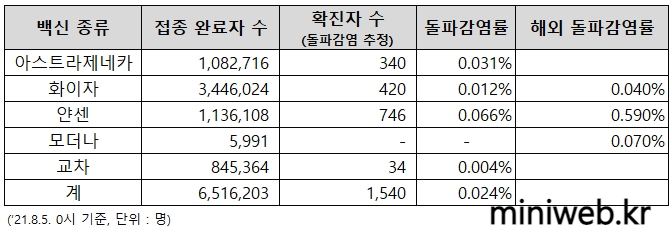 | 백신 종류 | 접종 완료자 수 | 돌파감염률 |