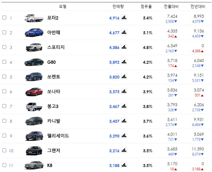 그랜저가 K8 보다 조금 더 많이 팔렸어요.
