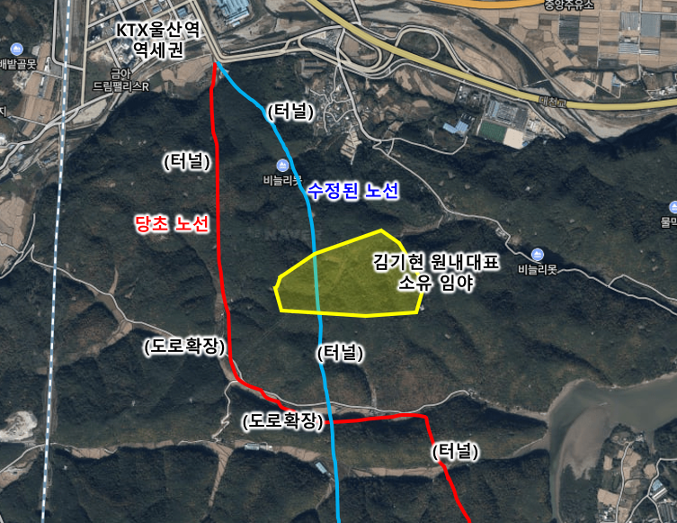 사실 아직 택지가 된 것은 아닙니다. 수정된 노선은 산악 지역을 그대로 관통하는 노선이라 처음부터 끝까지 터널로 설계될 가능성이 높습니다. 즉, 김기현 의원 소유의 임야의 지하에 그냥 터널이 지나가게 될 가능성이 높습니다.