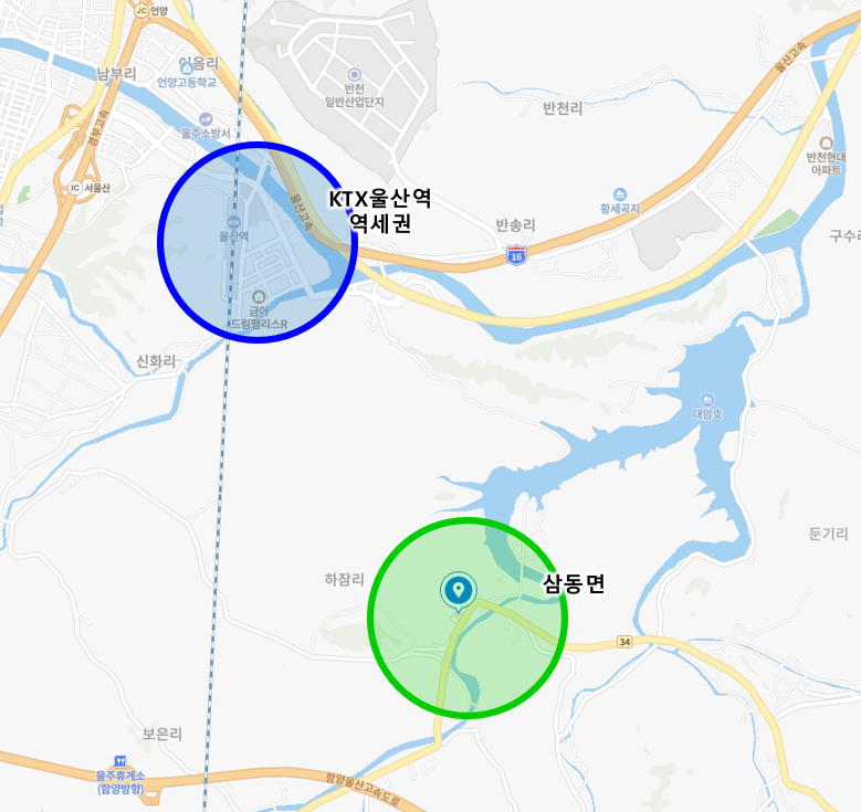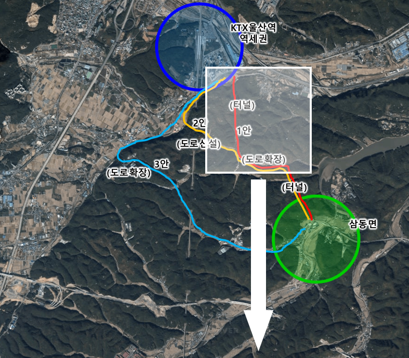 2007년 신설된 KTX울산역 일대와 교통 소외 지역인 삼동면을 도로로 잇는 방법에 대해 타당성 검토에 들어가게 됩니다. 문제는 두 지점 간에는 산악지역이라 1자로 선을 긋듯이 도로를 내는 것이 어렵습니다. 터널을 뚫고 다리를 놓고 하면 공사비가 많이 들기 때문이죠.