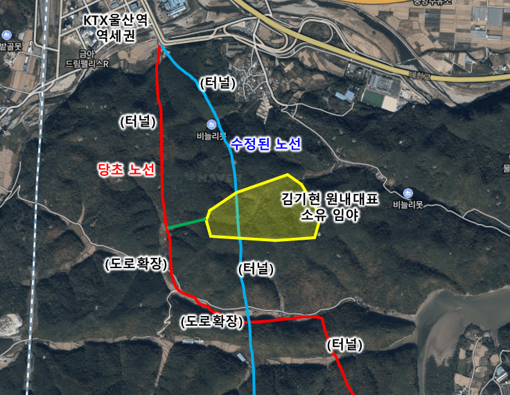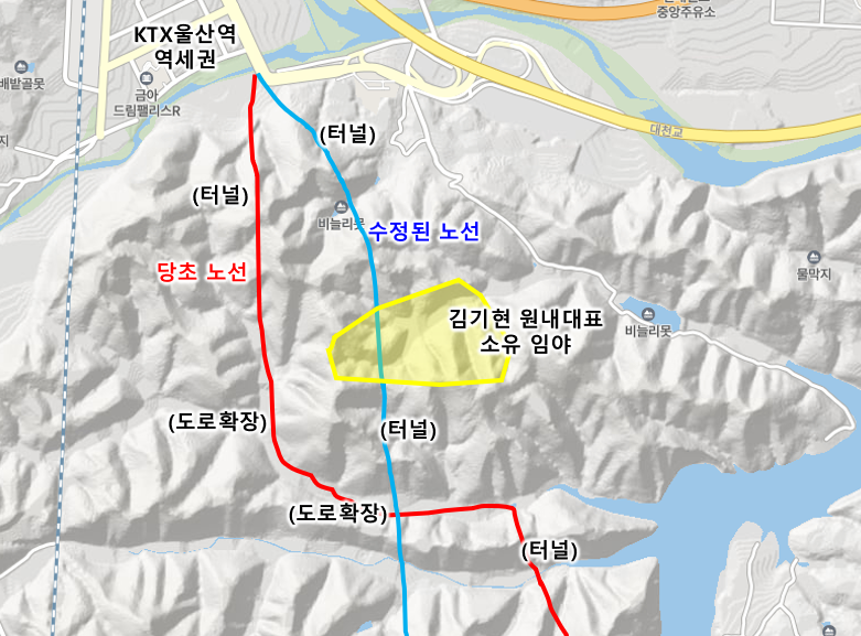 오히려 김기현 의원 자신의 임야를 맹지에서 택지로 바꾸고 싶었다면 당초 노선을 그대로 두고 연결도로를 추가하는 것이 더 나았을 거라는 생각을 해봅니다.