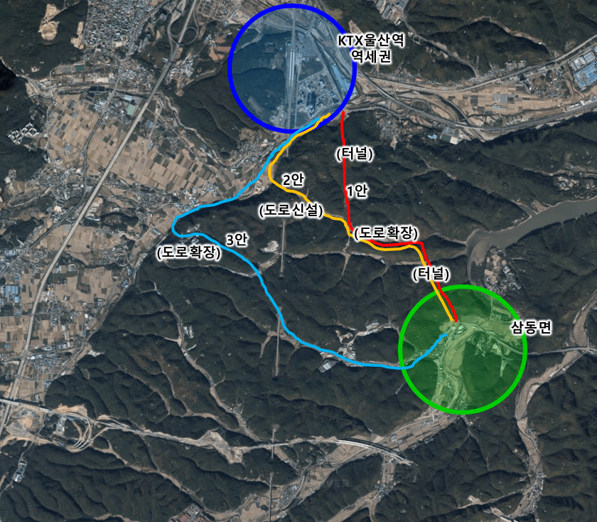 2007년 신설된 KTX울산역 일대와 교통 소외 지역인 삼동면을 도로로 잇는 방법에 대해 타당성 검토에 들어가게 됩니다. 문제는 두 지점 간에는 산악지역이라 1자로 선을 긋듯이 도로를 내는 것이 어렵습니다. 터널을 뚫고 다리를 놓고 하면 공사비가 많이 들기 때문이죠.