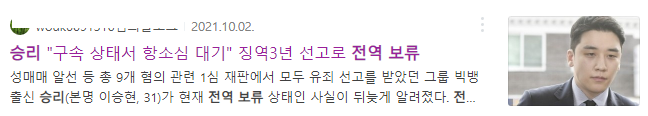 가수(?) '승리'가 군사재판 도중에 법정 구속되고 이로 인해 '전역보류' 되었다는 뉴스가 얼마 전에 나왔습니다. 군사재판 2심 앞둔 승리 전역보류..이유는? 성매매 알선 혐의 등으로 징역 3년을
