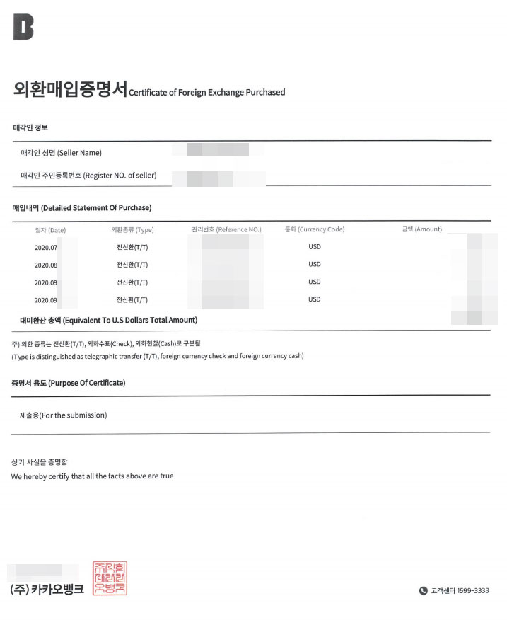 인터넷은행답게 오프라인 지점을 방문하지 않고도 저렇게 때깔나는 문서를 집에서 출력할 수 있습니다. 거래내역서만 출력하셔도 될 것 같은데, 저는 좀더 완벽을 기하고자 외환매입 증명서도 함께 출력했습니다.