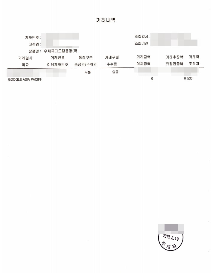 우체국은 따로 양식 없이 '거래내역'을 단순 출력한 다음, 명판 날인을 해서 주더군요. ^ㅅ^;;