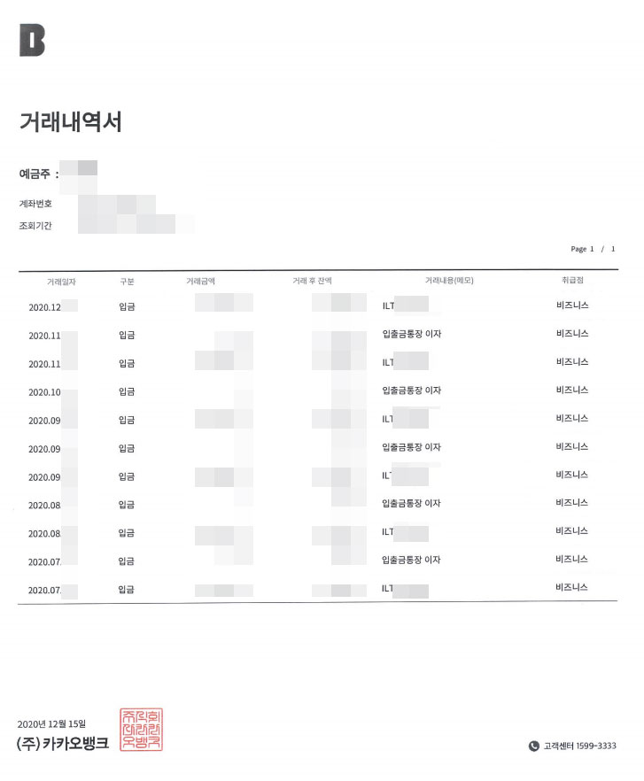 '계좌별 거래명세표' 라는 것을 요청하시면 됩니다. 이때 계좌번호와 조회기간을 불러주시면서 "비고 내용에 '외화송금'이라고 기재된 걸로 조회해주시면 됩니다" 라고 말씀하시면 아주 완벽합니다. 기업은행은 입금자(Google Asia Pacific)가 표시되지 않기 때문에 이렇게 검색해서 입금내역을 찾아줍니다.