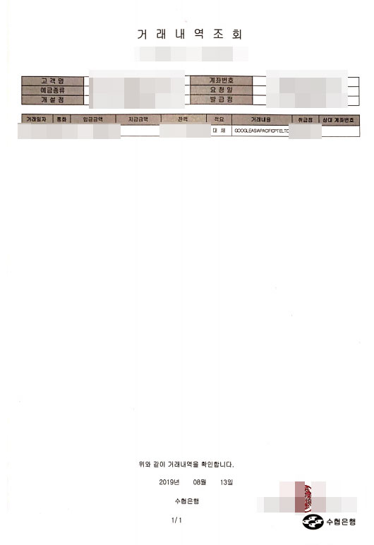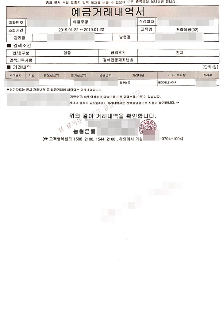 수협은 '거래내역조회' 라는 문서네요. Google에서 입금한 내역을 조회하고 싶다고 말씀하시고, 입금 날짜까지 불러주시면 아주 좋습니다. 발급 비용이 있습니다. ㅠㅠ