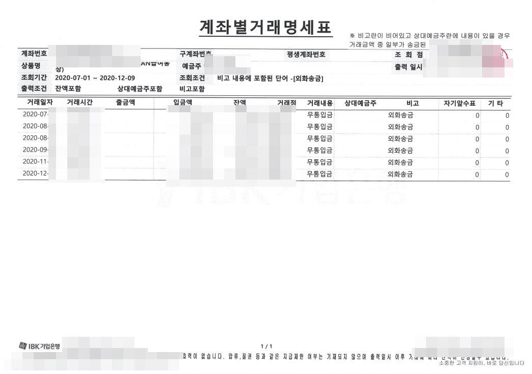 '계좌별 거래명세표' 라는 것을 요청하시면 됩니다. 이때 계좌번호와 조회기간을 불러주시면서 "비고 내용에 '외화송금'이라고 기재된 걸로 조회해주시면 됩니다" 라고 말씀하시면 아주 완벽합니다. 기업은행은 입금자(Google Asia Pacific)가 표시되지 않기 때문에 이렇게 검색해서 입금내역을 찾아줍니다.