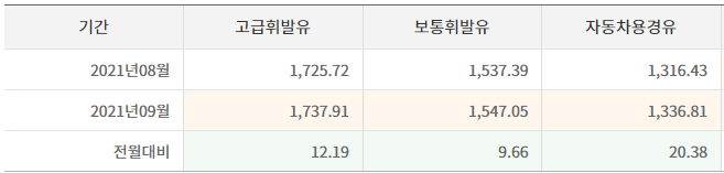 현재(2021년 9월 오피넷 보통휘발유 기준) 경유 가격은