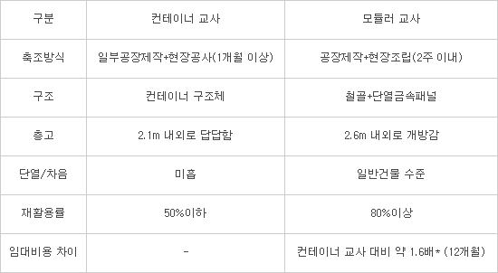 | 모듈러 교실 | 필요한 기간만 대여형으로 짧게 사용하고 바로 철거가 가능하다. 상대적으로 비용이 적게 든다. 2~3개월이면 교실 사용이 가능하다. 철거가 용이하다. |