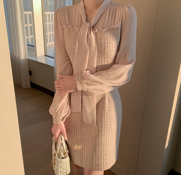 6. 금사 트위드 패브릭 쉬폰 리본 타이 배색 미니 원피스 (89,000 원)