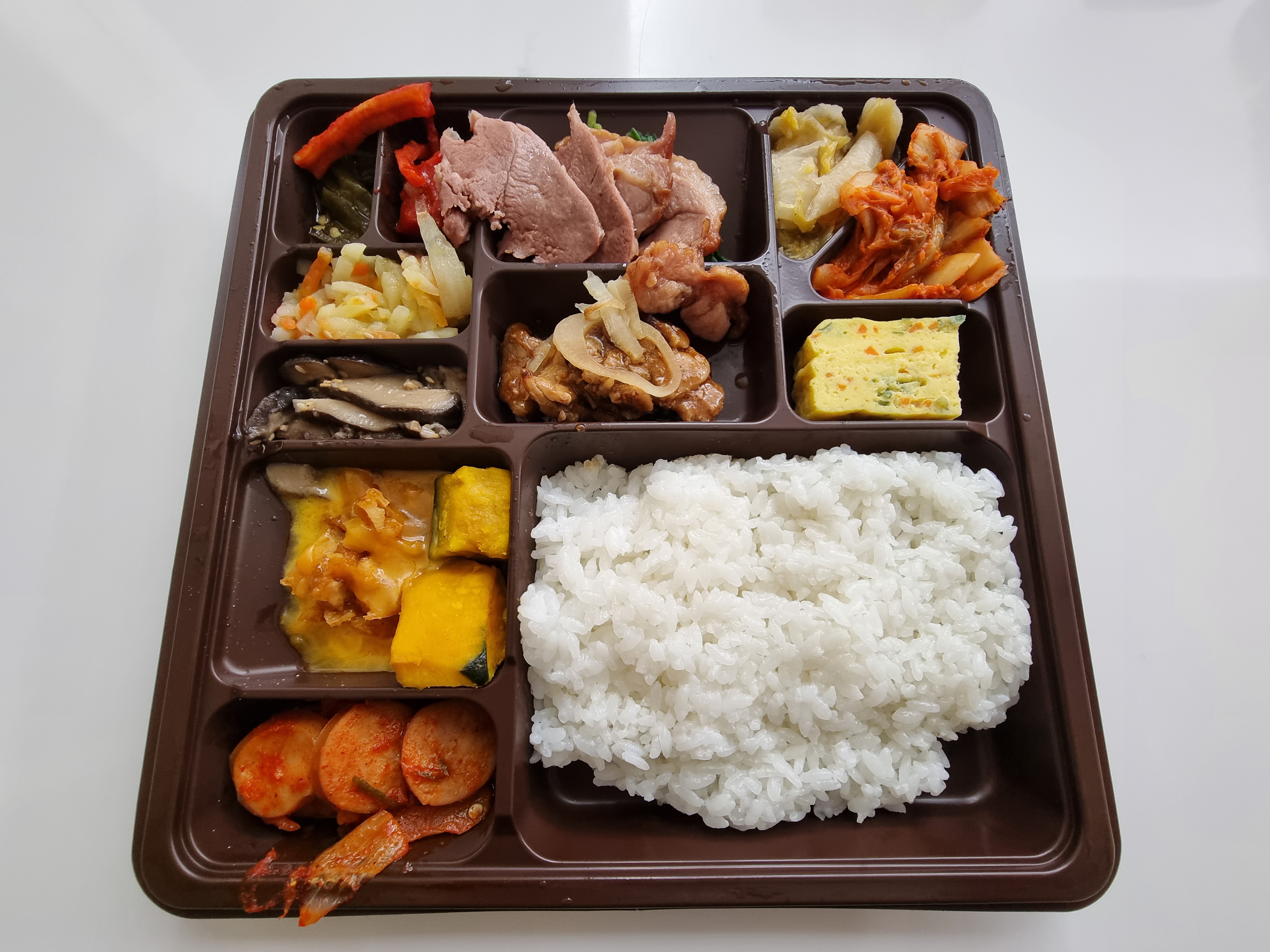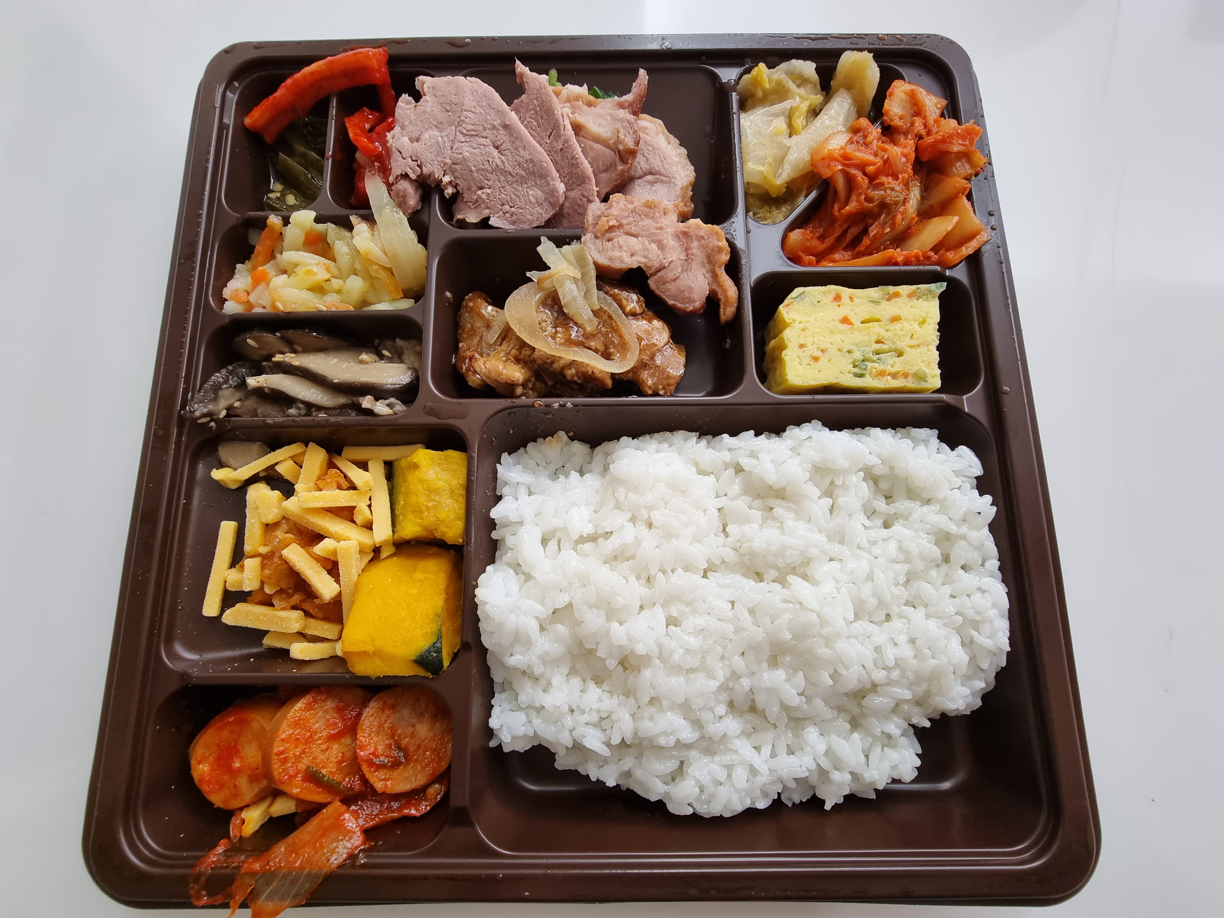 - 밥 왼쪽에 있는 것은 치즈 단호박입니다. 훈제오리와 밥 사이에 있는 것은 치킨 너겟(깐풍기일수도?!?)입니다.