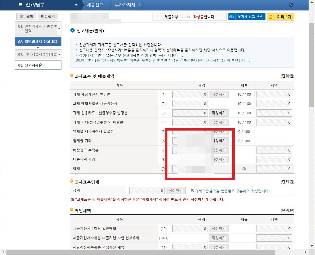 아까 전 화면에서 입력했던 영세율 매출 금액이 표시가 됩니다.