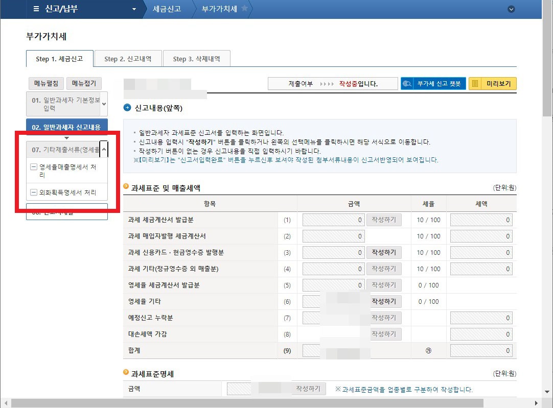과세표준 및 매출세액 항목에서 영세율 기타 > 작성하기를 누릅니다.