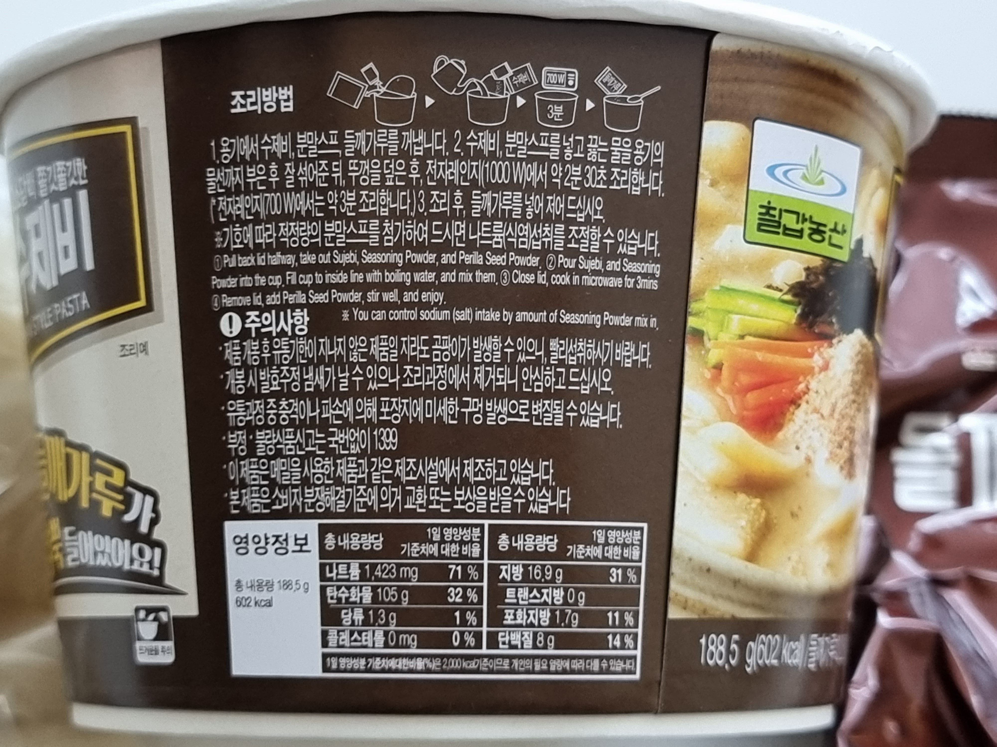 - 조리법 중에 '뚜껑을 덮은 후 전자렌지에 돌리라'는 말이 있는데, 잘 못 작성된 것 같습니다. 덮을 수 있는 뚜껑이 없어요. 그냥 일반 컵라면 같이 비닐 뚜껑만 달려 있어서, 벗겨내면 끝입니다. 용기를 덮을 수 없게 되어 있어요. 덮지 않고 조리했지만 아무런 문제가 없었습니다.