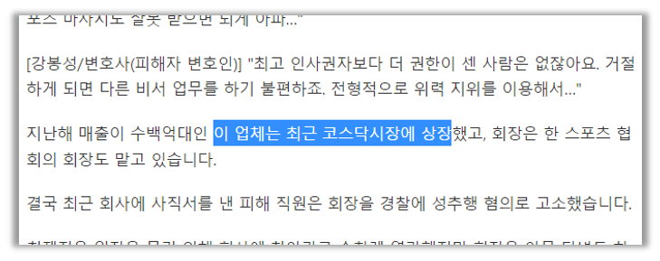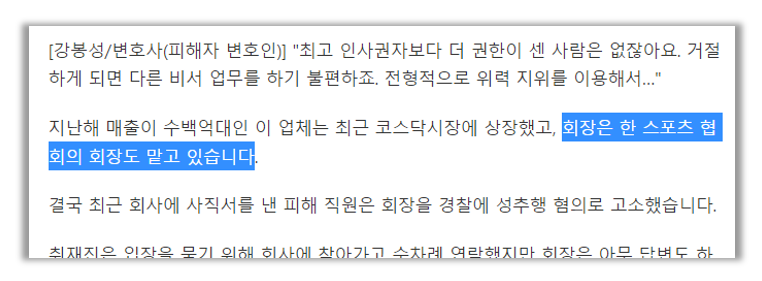 [뉴스데스크] ◀ 앵커 ▶ 저희는 오늘부터 한 중소 자동차부품 업체의 회장이자 주요 스포츠협회 회장인 이 모 회장의 성폭력과 갑질 의혹을 폭로하려고 합니다. 회장의 비서가 지속적으로 당한