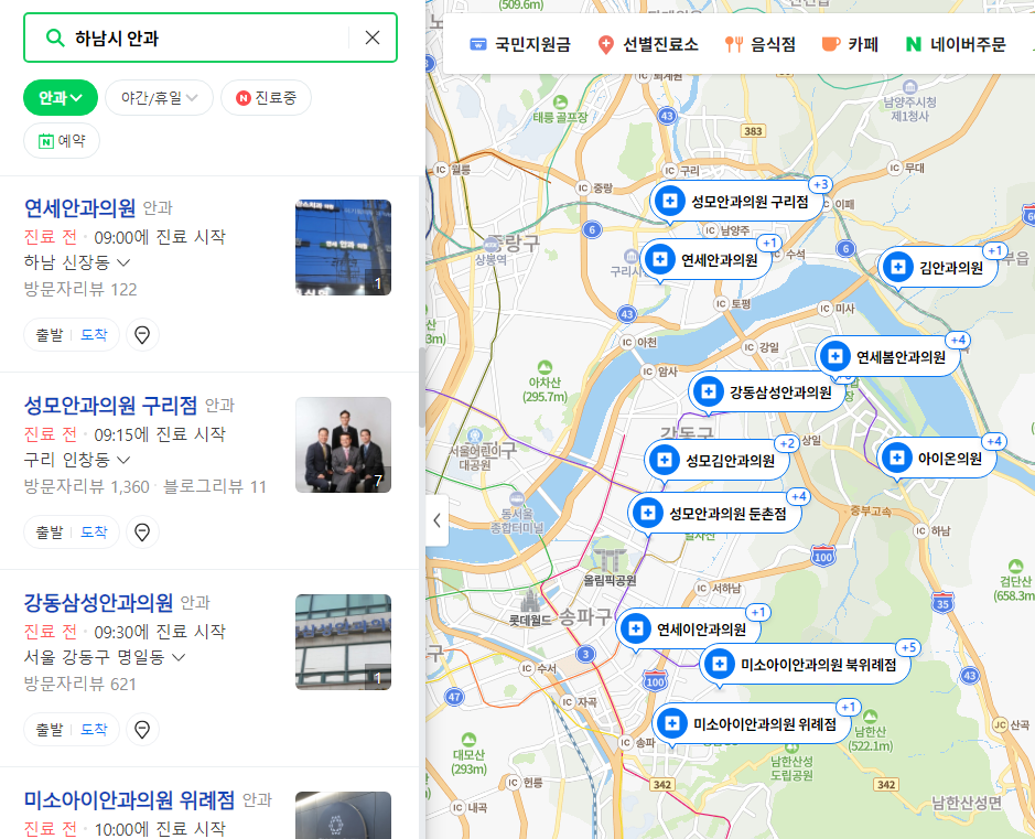 네이버 지도에서 '하남시 안과'를 검색해봅니다.