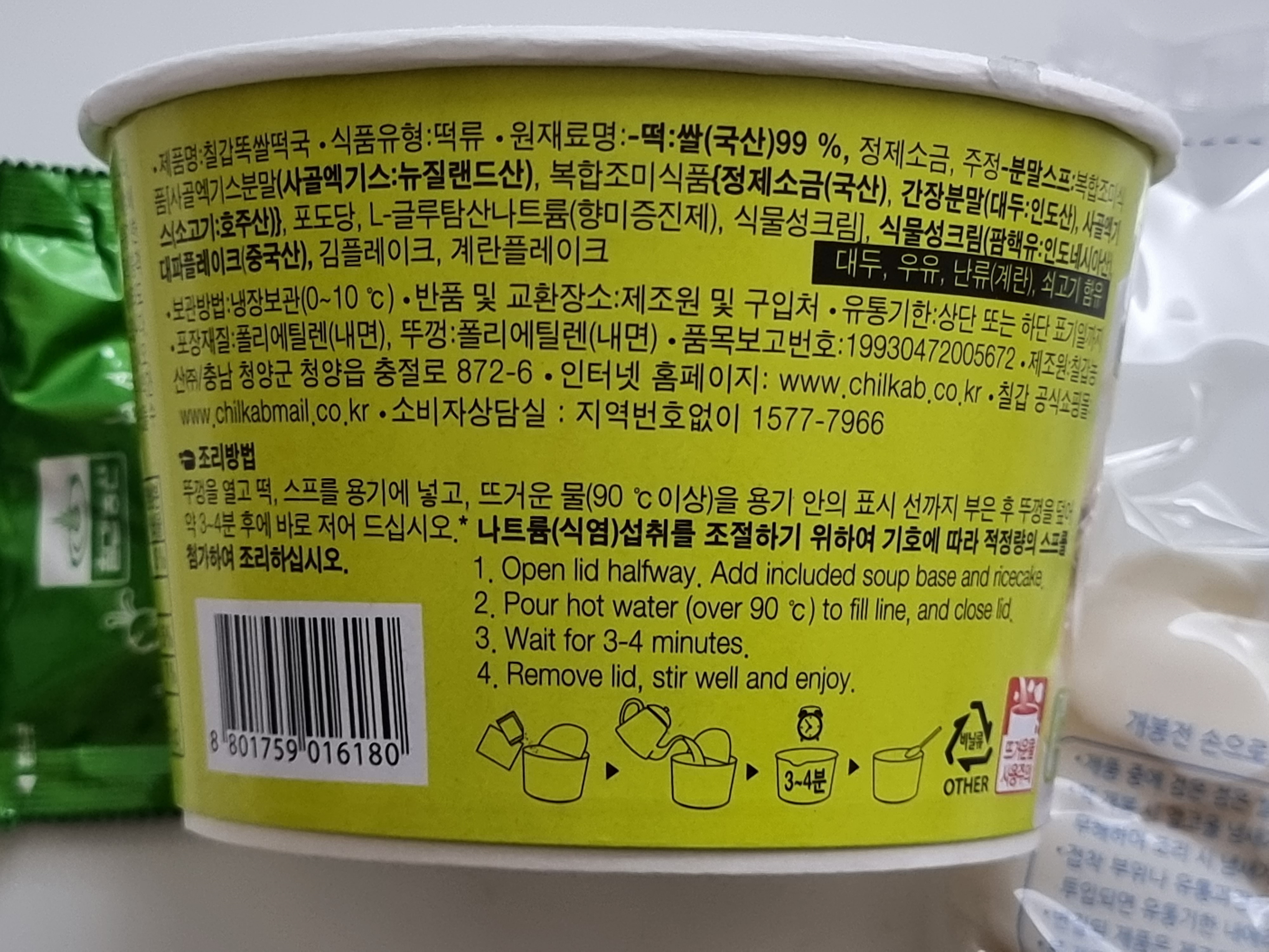 - 요즘 대부분의 국물 음식류 조리법이 '뜨거운 물을 붓고, 추가로 전자렌지에 돌리기'인데, 이 제품은 컵라면처럼 뜨거운 물만 부어도 되어서 매우 간편합니다. 이래 가지고 떡이 익을까 살짝 걱정이 되었지만 기우였네요. 쫄깃쫄깃 아주 맛있습니다.