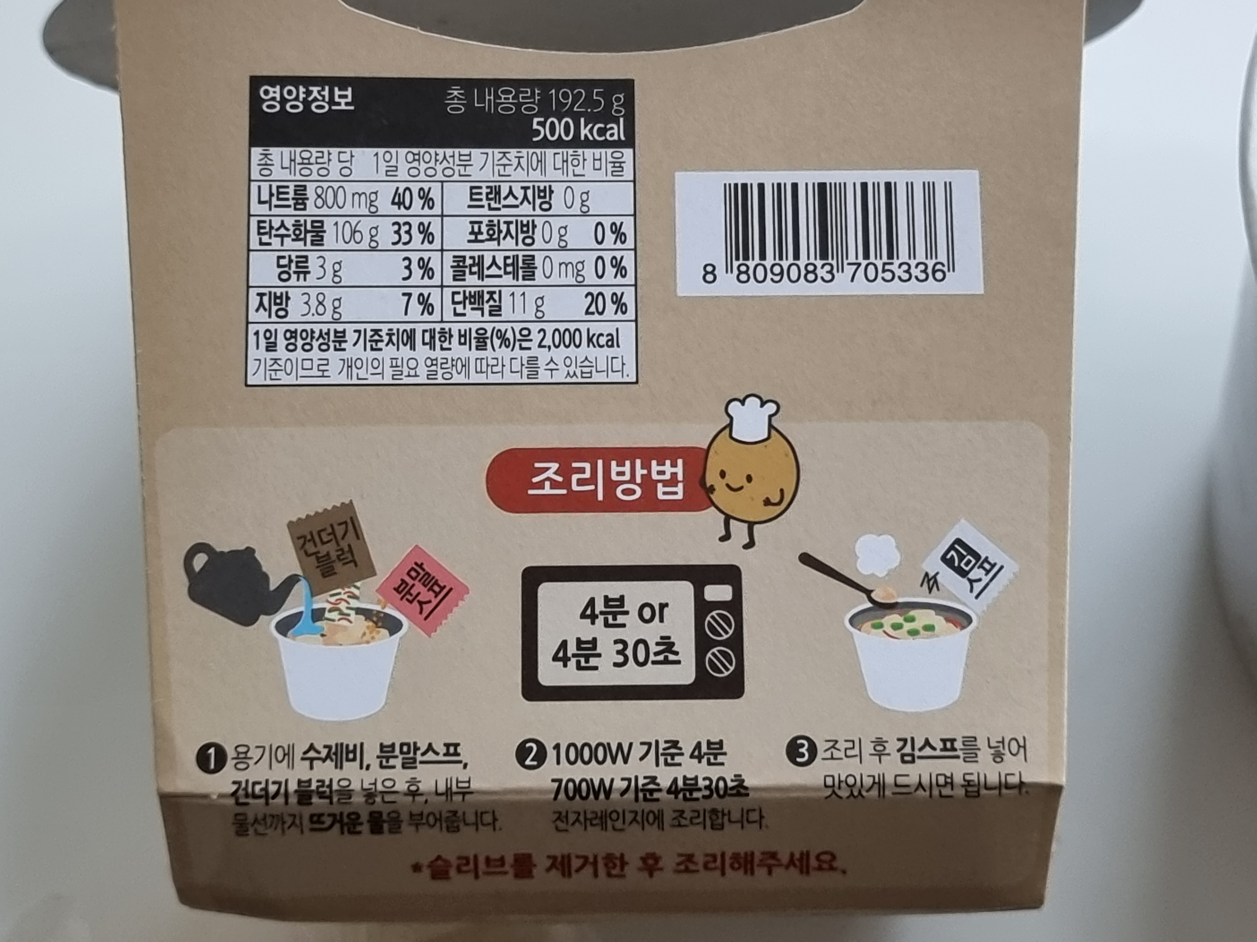 - 조리법대로 700W 4분 30초 돌렸는데, 끓어 넘쳤습니다. 전자렌지 밑판을 씻거나 닦아야 하는 번거로움이 있네요. 접시 하나 깔고 돌리는 게 좋을 것 같습니다.