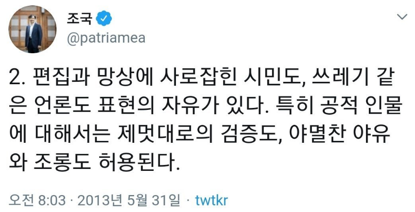 전우용, 조국, 진중권도 마찬가지입니다. 이따금 이들이 SNS에 배설하는 말들이 우리에게 쾌감을 줄 수는 있습니다. 하지만 그렇다고 그것들의 본질은 독이라는 사실이 달라지지는 않습니다.