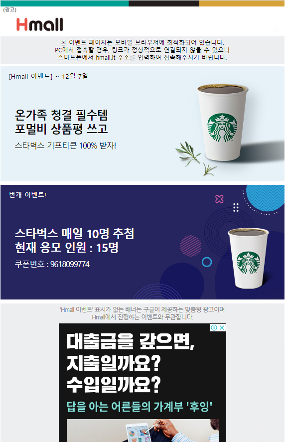 Hmall 고객을 위한 번개 이벤트, 매일매일 10명씩 스타벅스 쿠폰 증정