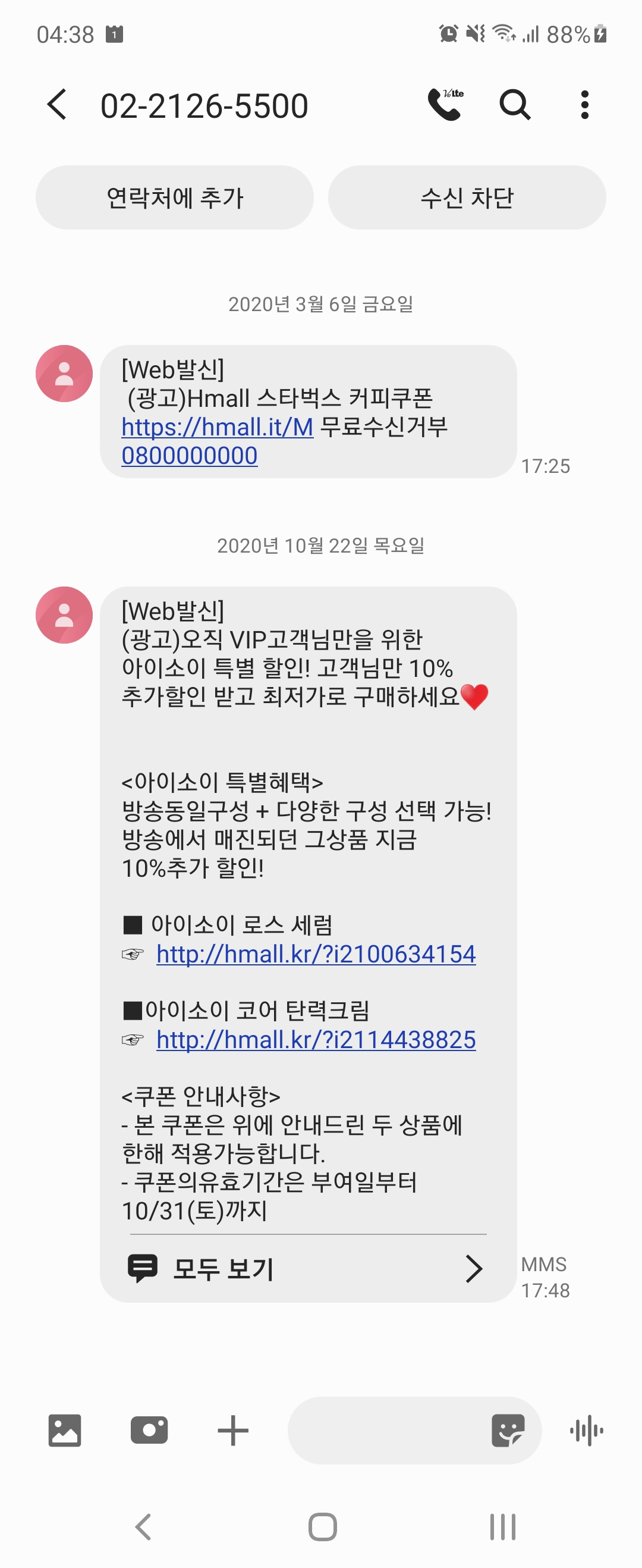 그리고 그 위에 과거 문자 수신 내역을 보니 스타벅스 커피쿠폰이라는 낚시성 다분한 유혹 링크가 뜨띃!!!