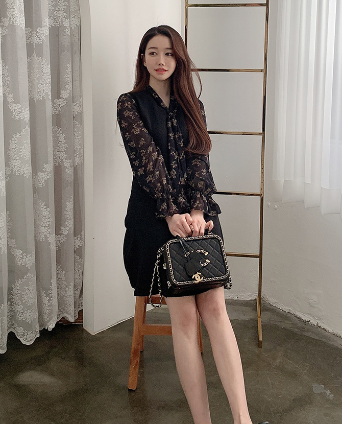 깔끔한 디자인에 소매부분과 넥라인 부분만 플라워 패턴으로 포인트를 줘서 페미닌한 미디 기장의 원피스예요! 격식차릴때, 데이트 갈때~ 입으면 너무 돋보이는 원피스!