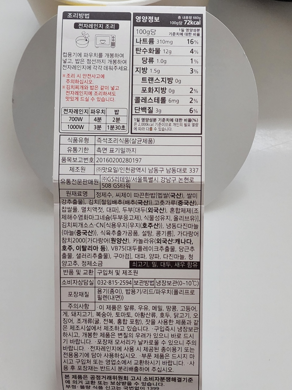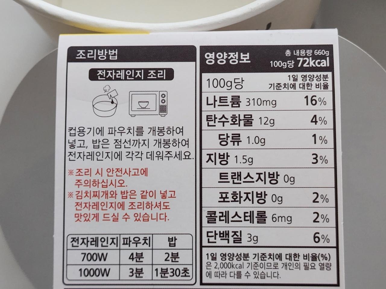 - 파우치 조리는 3~4분, 햇반 조리는 1분30초~2분인데, 저는 따로 조리했습니다만 조리법에는 밥을 국물에 섞어서 같이 조리해도 된다고 적혀 있습니다. 같이 조리할 경우에는 3~4분을 돌리면 되는 걸까요? 아니면 합산 시간인 4분30초~6분을 돌려야 하는 걸까요? 이것까지 세심하게 설명해주면 좋을 텐데요. 다음 번에 사먹을 때 테스트 해 보고 내용 업데이트하겠습니다.
