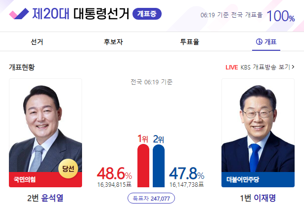 하지만 마침내 진행된 2022년 3월 9일 20대 대통령 선거 결과는 윤석열 대통령이군요. ^ㅅ^;;;