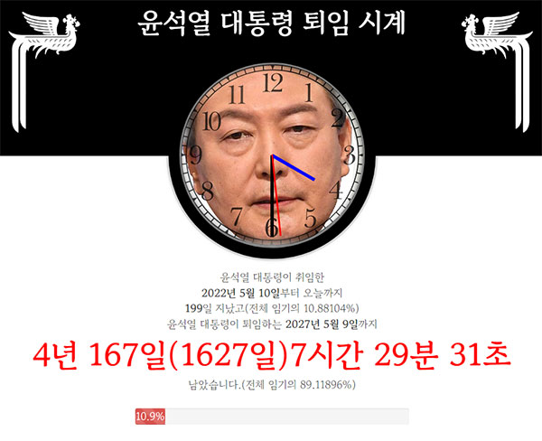 예전에 MB(이명박)가 대통령 당선되었을 때도 임기가 얼마나 남았는지 카운트다운 하는 사이트가 있었던 것 같은데요. 윤석열 대통령도 잔여 임기 시계가 등장했습니다. 예전에 보았던 임기 시계보다 훨씬 세련되어졌는데요.