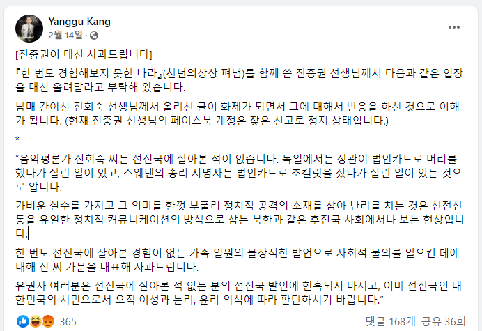 한 번도 선진국에 살아본 경험이 없는 가족 일원의 몰상식한 발언으로 사회적 물의를 일으킨 데에 대해 진 씨 가문을 대표해 사과드립니다.