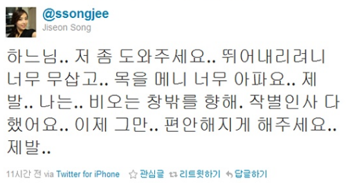 2011년 5월 7일 새벽 송지선 아나운서는 자신의 트위터에 자실을 암시하는 글을 올립니다.
