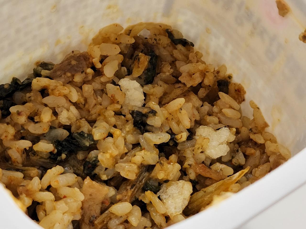 제품에도 적혀 있지만 '철판에 눌러붙은 누룽지 식감'을 구현했다고 합니다. 근데 이게 뭐가 좋은지 모르겠어요. 메인 요리를 먹고 남은 거를 긁어 먹는 '보너스' 감성과 남은 거를 긁어 먹는게 메인이 되는 감성은 좀 다른 것 같은데요. 먹는 내내 딱딱한 누룽지밥을 먹고 있자니 고역입니다;;