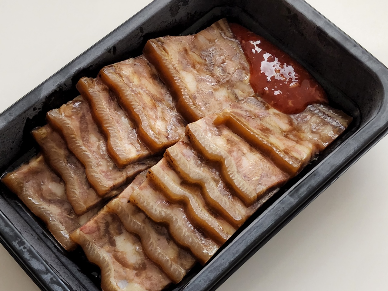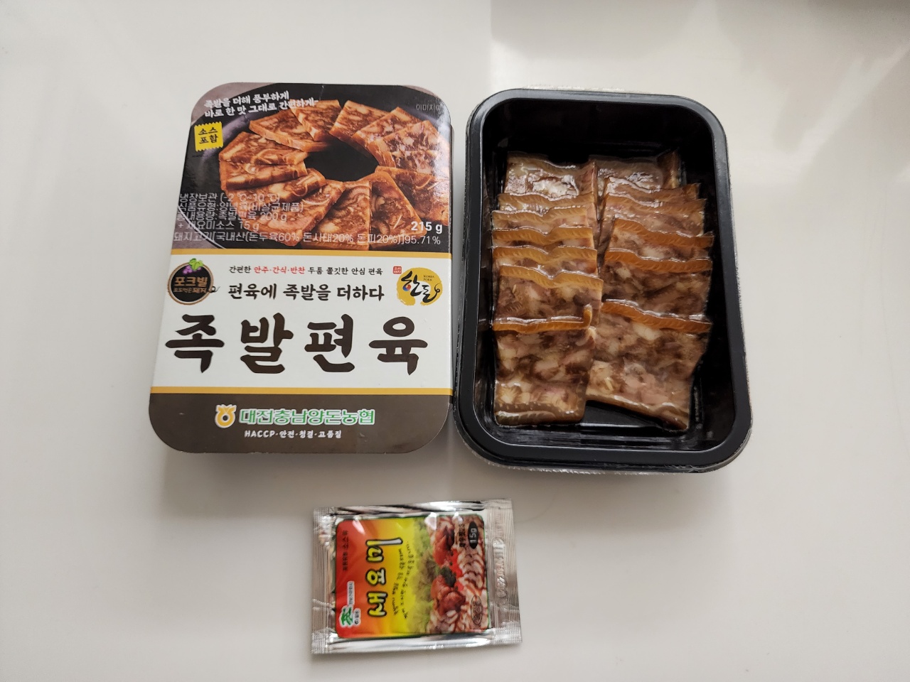 편육에다가 족발의 껍데기 부분을 붙여놓은 듯한 제품입니다. 맛에서 딱히 족발 느낌은 찾아보기 어렵고 비주얼만 그렇습니다. 그냥 고기 좋아하시는 분들은 한 번쯤 먹어볼만한 정도인데, 임팩트는 없어요. 별 2개 매길까 3개 매길까 고민했습니다.