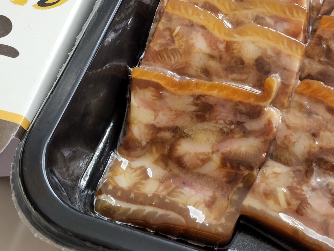 특이한 점은 제품 진공포장 방식인데요. 위 사진에서 보시는 것처럼 그릇 용기와 편육을 함께 진공 포장 해놨어요. 그래서 아래와 같이 뜯어야 하는데요. 포장에 들어가는 비닐 양을 줄인다는 의의가 있을 수 있겠네요;;