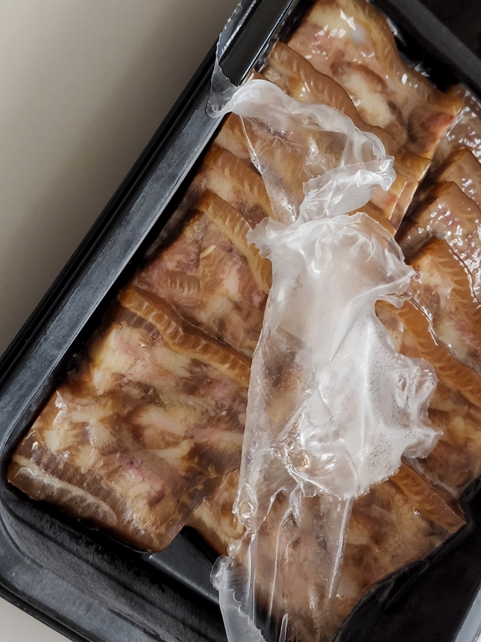 특이한 점은 제품 진공포장 방식인데요. 위 사진에서 보시는 것처럼 그릇 용기와 편육을 함께 진공 포장 해놨어요. 그래서 아래와 같이 뜯어야 하는데요. 포장에 들어가는 비닐 양을 줄인다는 의의가 있을 수 있겠네요;;