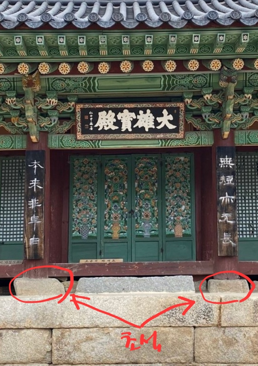 위 사진은 강화도 정수사 대웅보전 전경입니다. 기둥을 받치고 있는 두껍고 넓적한 돌이 바로 '초석'입니다. 그 위에 마루가 있지요. 마루 위에 앉기도 하고 발로 밟고 걸어다니기도 합니다. 그 마루 아래에서 기둥을 받치고 있는 돌이고 저기에 어떤 불교적 신성함이 있을 수 있을까요?