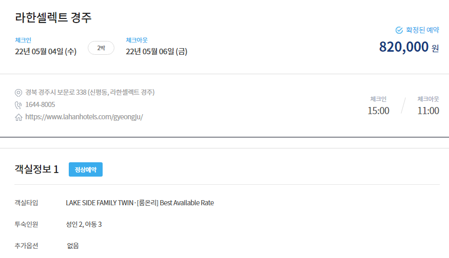 위 예약 확인 페이지를 보시면 아동 3명으로 예약된 것 보이시죠? 많은 호텔에서 어린이를 최대 2명까지만 선택할 수 있게 하고 있어서, 부득이하게 방을 2개를 잡은 후 한 방에서 같이 자는 비효율적인 숙박을 해야 하는 경우가 많았습니다. 어떤 호텔은 일단 예약상으로는 2명으로 하고 현장에서 인원 추가 비용을 받는다거나 추가 없이 재량껏 입실시켜주기도 하구요.