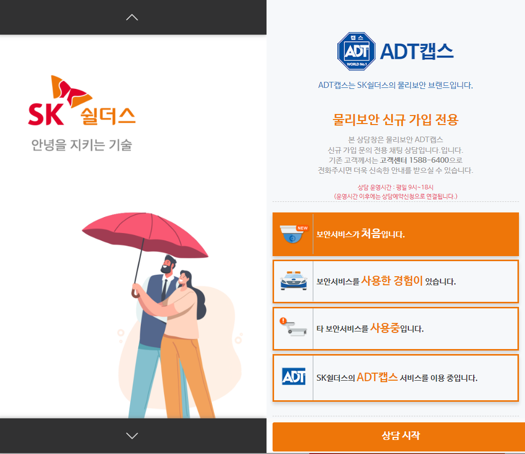 저는 기존 고객이므로 마지막 버튼 'SK쉴더스의 ADT캡스 서비스를 이용 중입니다.' 라는 메뉴를 선택하고 상담 시작 버튼을 누릅니다.