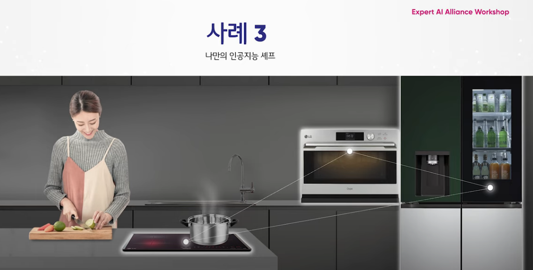 AI가 사용자가 원하는 조리법에 부합하는 요리를 할 수 있도록 돕는다는 건데요. 예를 들어 치즈를 좋아하는 외국인 친구가 있는 사용자라면 모짜렐라 치즈가 들어간 된장찌개 등을 구상하고, AI를 활용해 LG 스마트 냉장고로 재료를 주문한 뒤 LG 인덕션과 LG 광파오븐으로 요리를 할 수 있댑니다. 초대형 AI가 요리에 대한 지식을 알려주거나 해당 조리를 위한 기기들이 미리 준비되도록 할 수도 있다고 하네요.