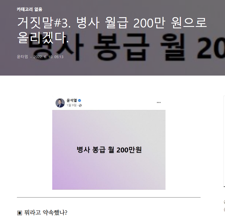 ▣ 뭐라고 약속했나? 윤석열 대통령은 후보자 신분이던 지난 2022년 1월 9일 페이스북에 '병사 봉급 월 200만 원'이라는 짧은 공약 글을 올렸습니다. 문재인 정부인 2021년 9월 국방부는 ‘2022~2026 국