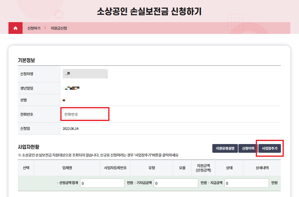 5. 전화번호를 입력한 후(신청 결과를 문자로 알려줍니다), '사업장 추가' 버튼을 눌러주세요.