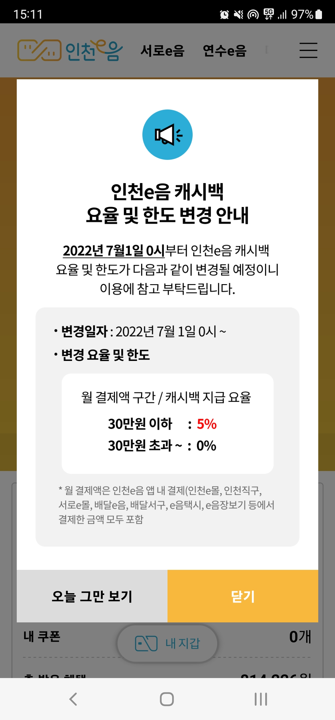네.... 유정복 시장 취임 당일부터 이음카드 캐시백 혜택은 10%에서 5%로 축소되어버렸네요. 결제 금액 한도도 줄었습니다.