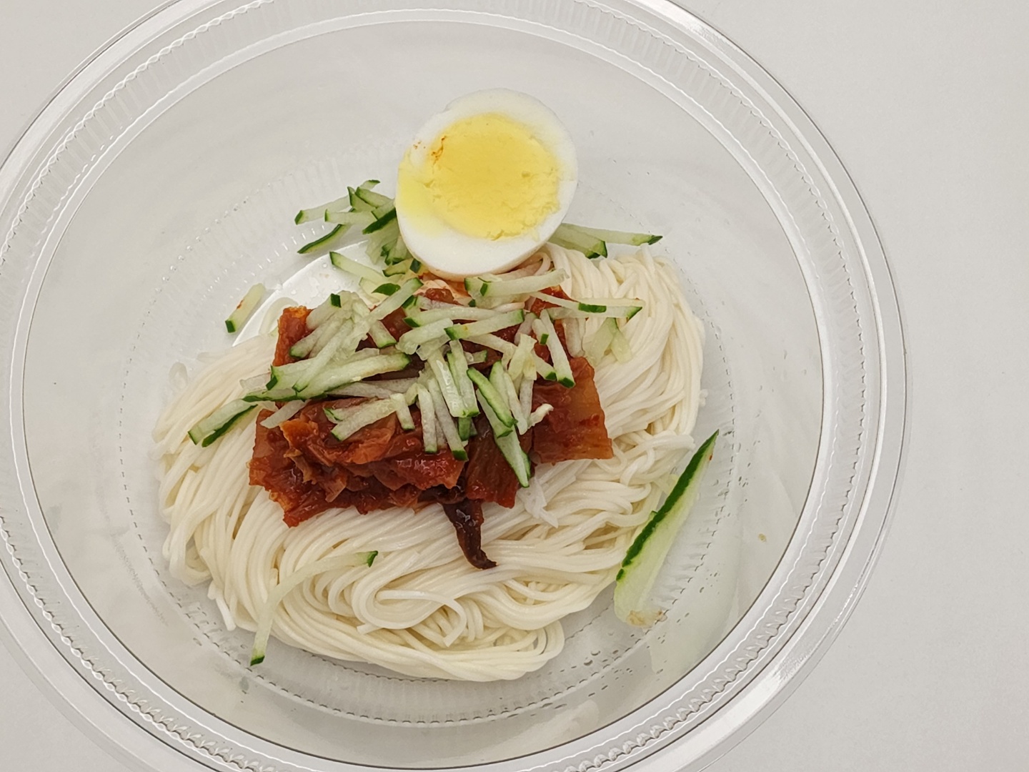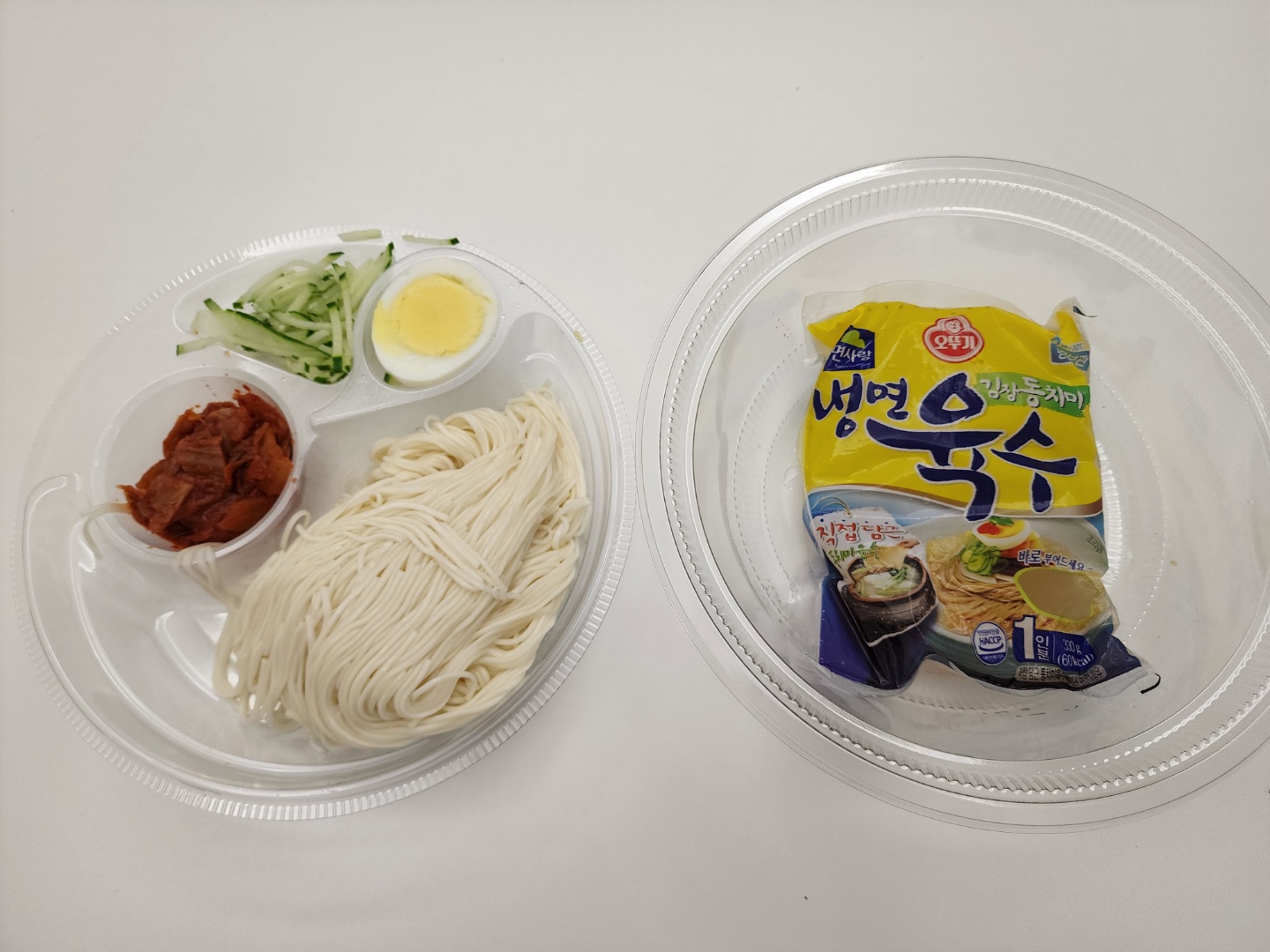 포장을 뜯고 내부 용기를 분리한 모습입니다. 내부 용기 아래쪽에 냉면 육수가 들어 있습니다.