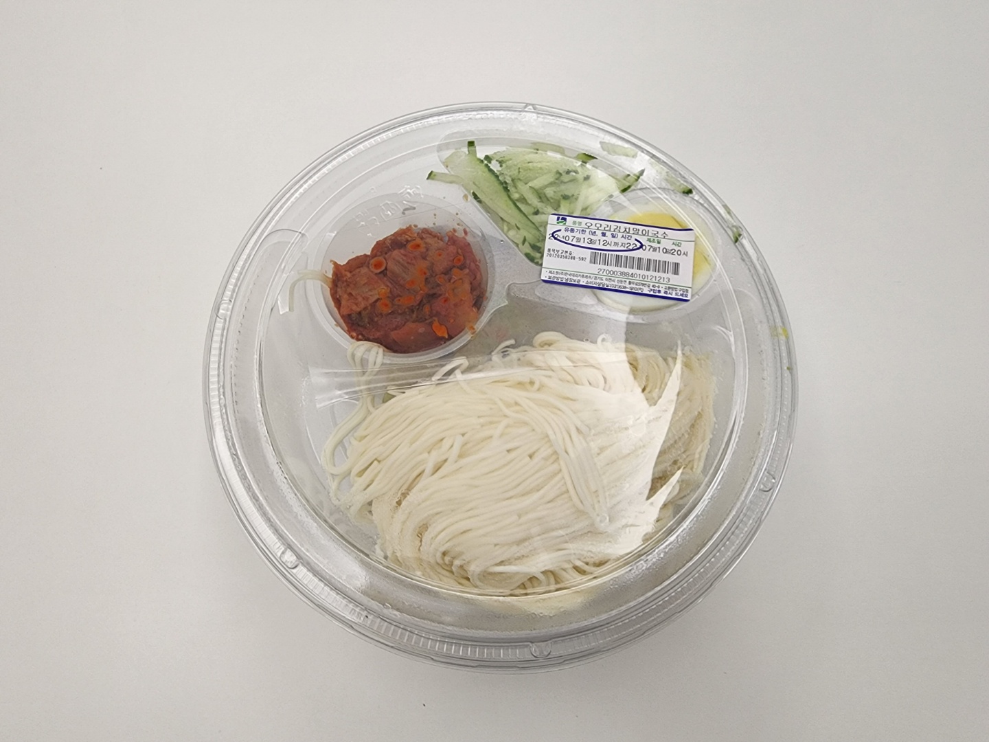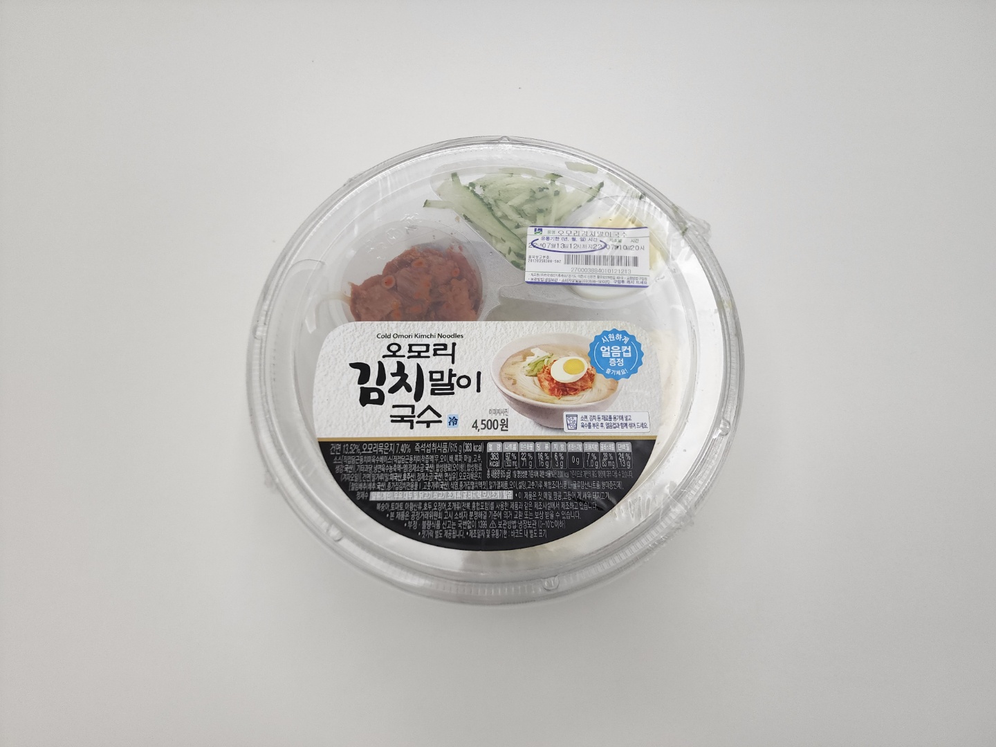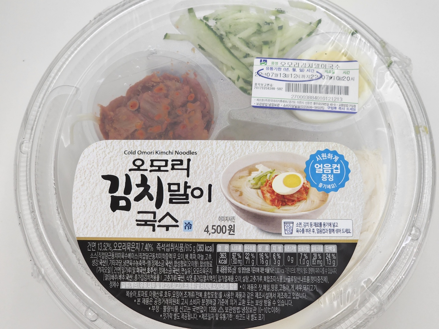 포장을 뜯지 않은 제품 모습입니다. 도시락 류처럼 유통기한이 매우 짧습니다. 육수가 들어 있고 냉장 상태로 유통되기 때문에 기본적으로 시원합니다만, 더 시원하게 드시라고 얼음컵을 증정하고 있었습니다. 집에 얼음이 있어서 안 받아 왔는데, GS25 멤버십 가입되어 있으시면 나만의 냉장고에 자동으로 보관됩니다.