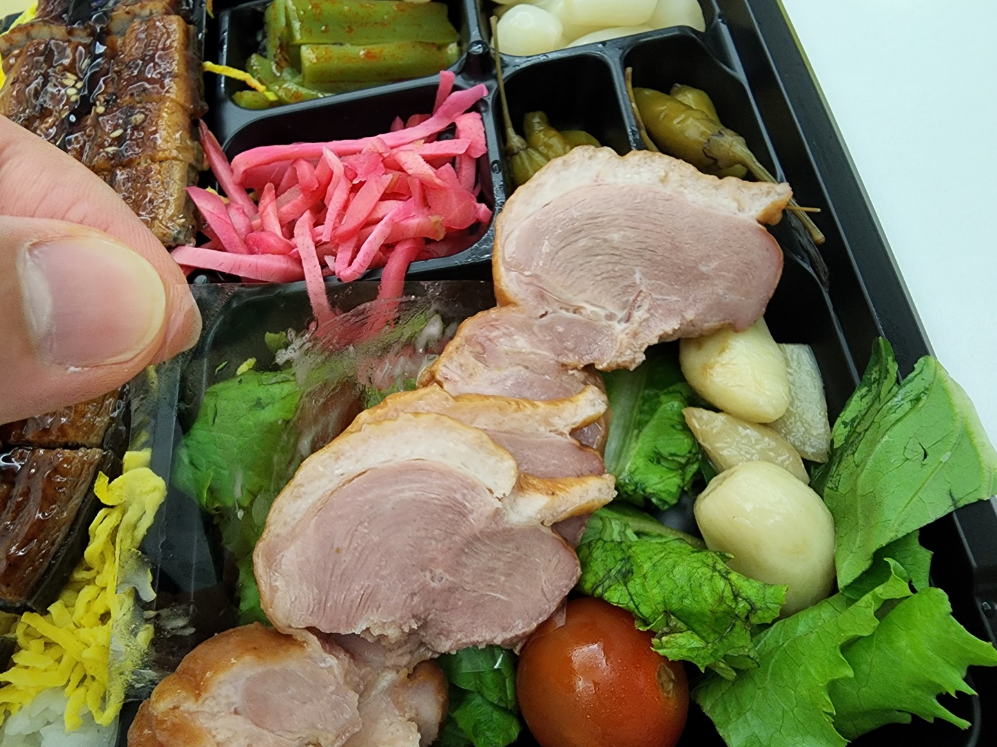 하지만, 뚜껑에는 장어 소스가 뚜껑에 뭍는 걸 막아주는 비닐이 붙어 있고, 샐러드와 훈제오리가 들러붙지 않게 하여 선도를 유지하는 비닐이 있습니다. 아무리 생각해도 뚜껑과 함께 도시락 째로 전자렌지를 돌릴 수 있는 비주얼이 아니란 말이죠.