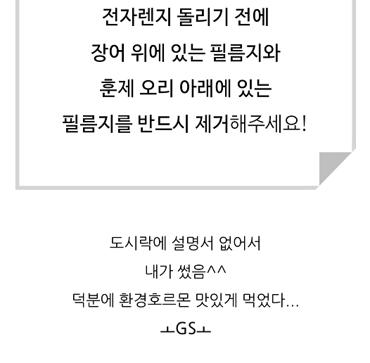 같은 조리법 설명 영역 안에 '전자렌지'랬다가 '전자레인지'랬다가 하는 건 그냥 애교로 넘어가겠습니다. 하지만 전자렌지를 돌리면 안되는 도시락을 전자렌지를 돌려도 되겠다는 착각을 하도록 만드는 문구를 굳이 집어넣는 이유는 도대체가 이해가 안되네요??????