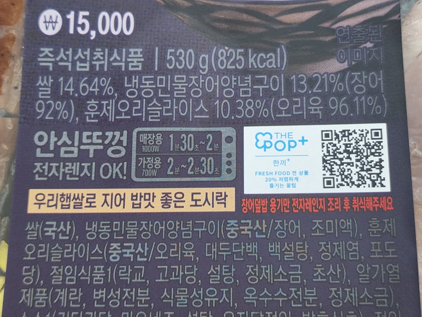 하지만, 뚜껑에는 장어 소스가 뚜껑에 뭍는 걸 막아주는 비닐이 붙어 있고, 샐러드와 훈제오리가 들러붙지 않게 하여 선도를 유지하는 비닐이 있습니다. 아무리 생각해도 뚜껑과 함께 도시락 째로 전자렌지를 돌릴 수 있는 비주얼이 아니란 말이죠.